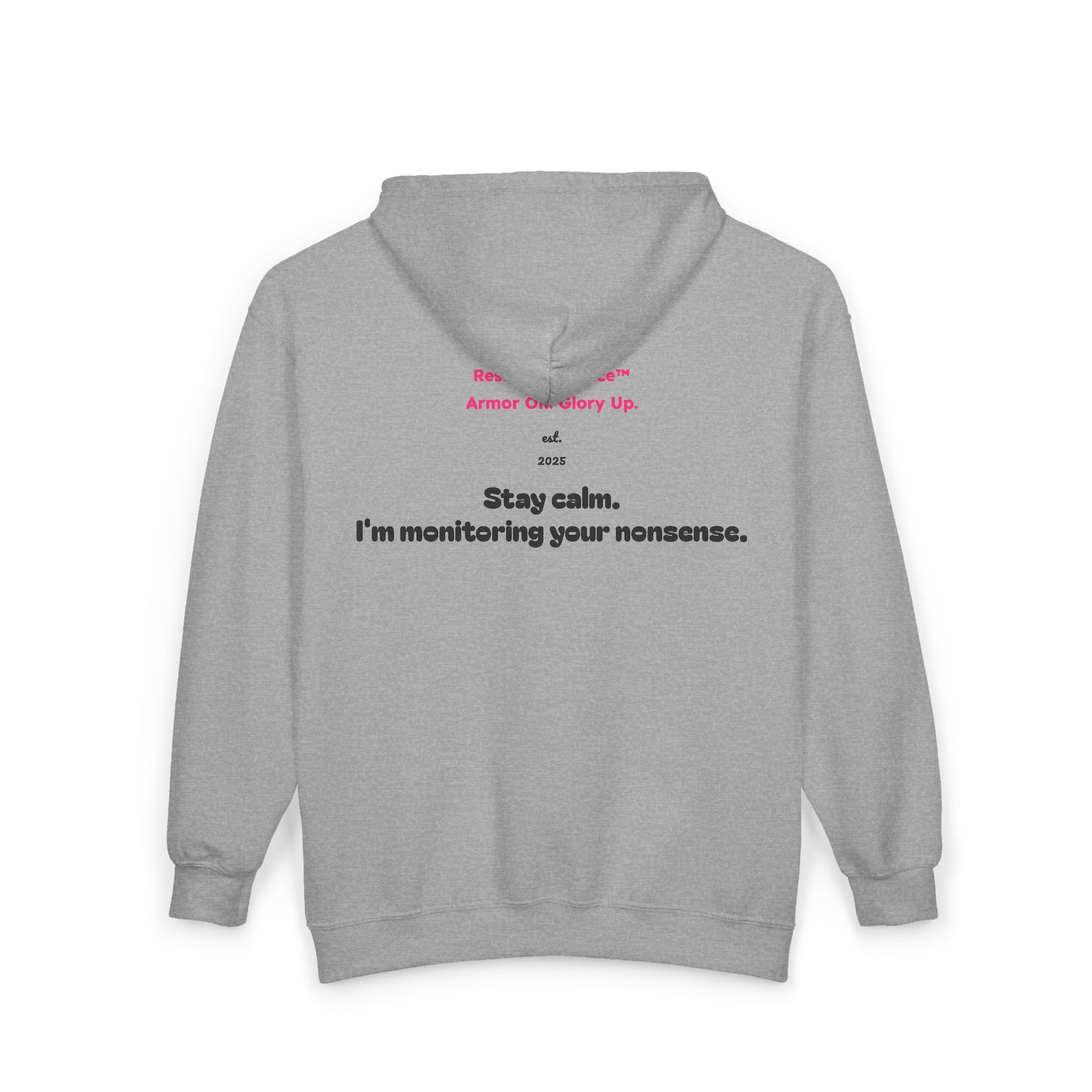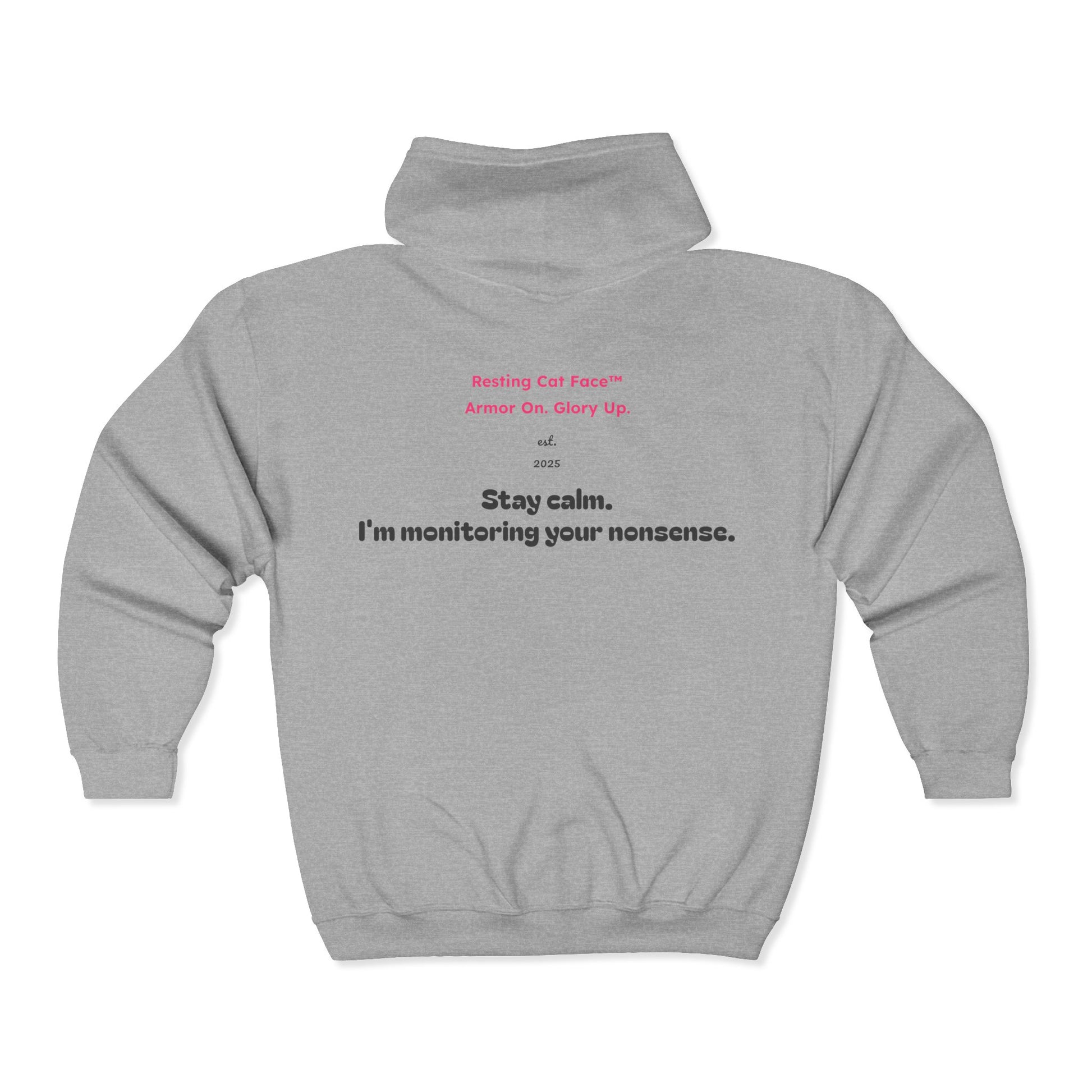 Back: bold print reads "Stay calm. I'm monitoring your nonsense."